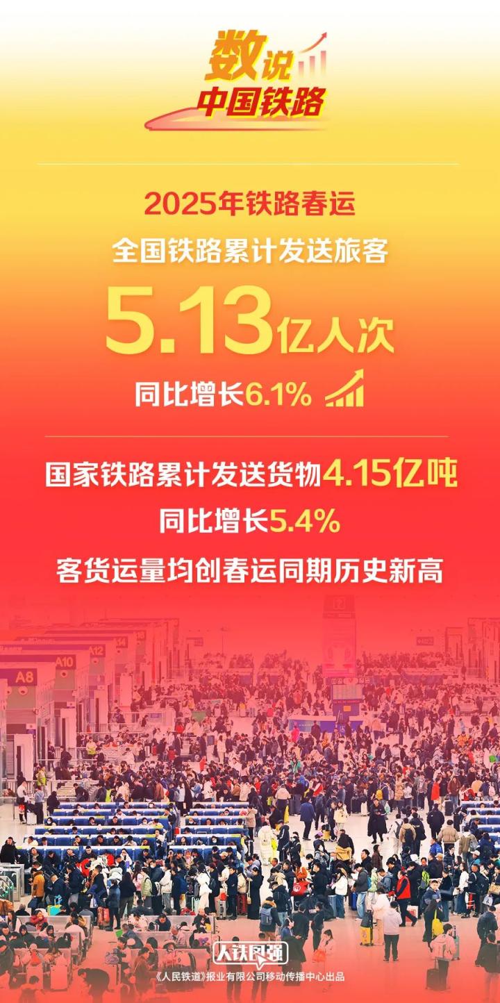 2月22日,为期40天的2025年铁路春运圆满收官,运输安全平稳有序,全国铁路累计发送旅客5.13亿人次,同比增长6.1%,国家铁路累计发送货物4.15亿吨,同比增长5.4%,客货运量均创春运同期历史新高。